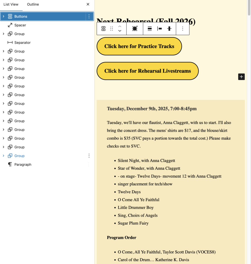 Each group contains the information for one week of the semester. Typically, there will be one Group at the top, followed by a Separator block, followed by some number of Group blocks. The Separator block represents the current time; all Group blocks above the separator represent future rehearsals, all those below represent the past.