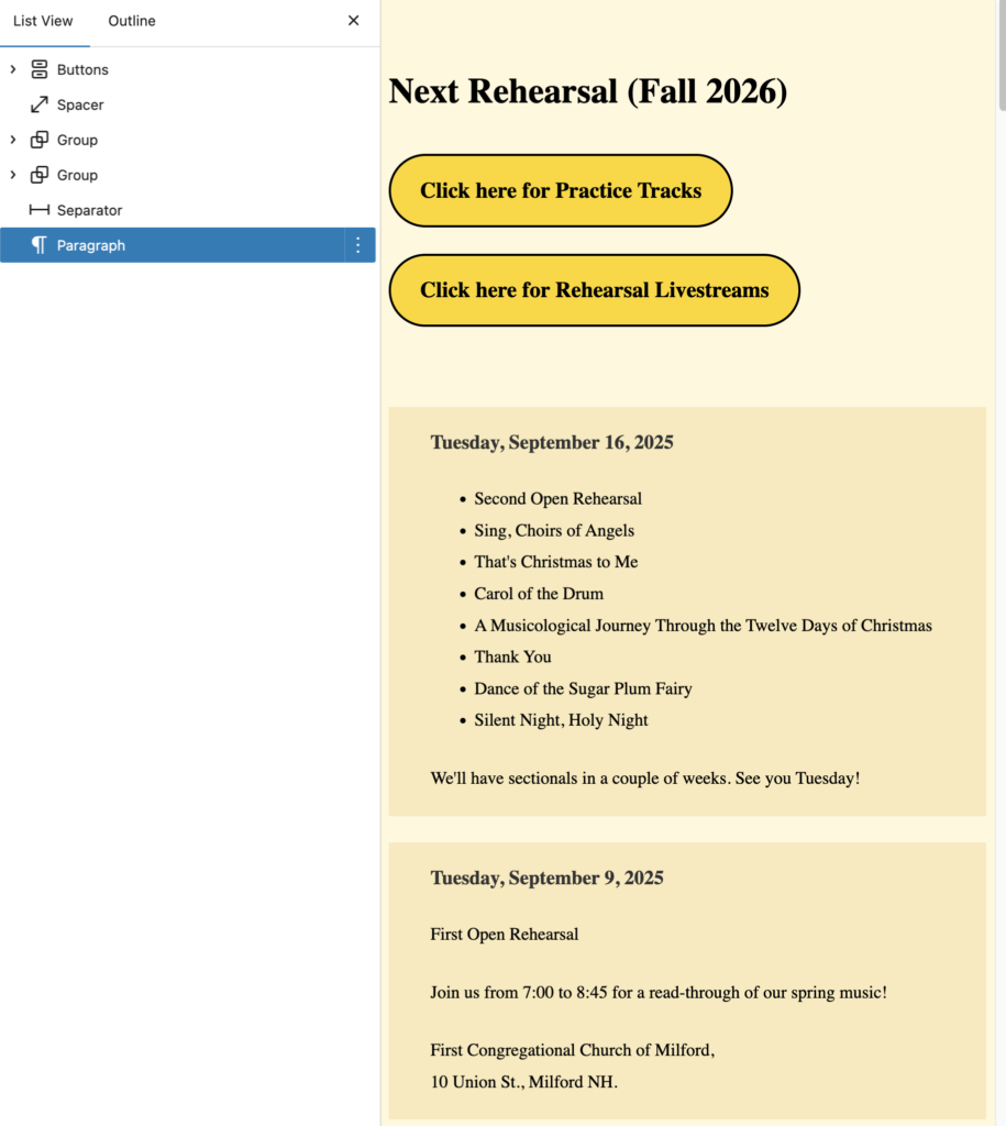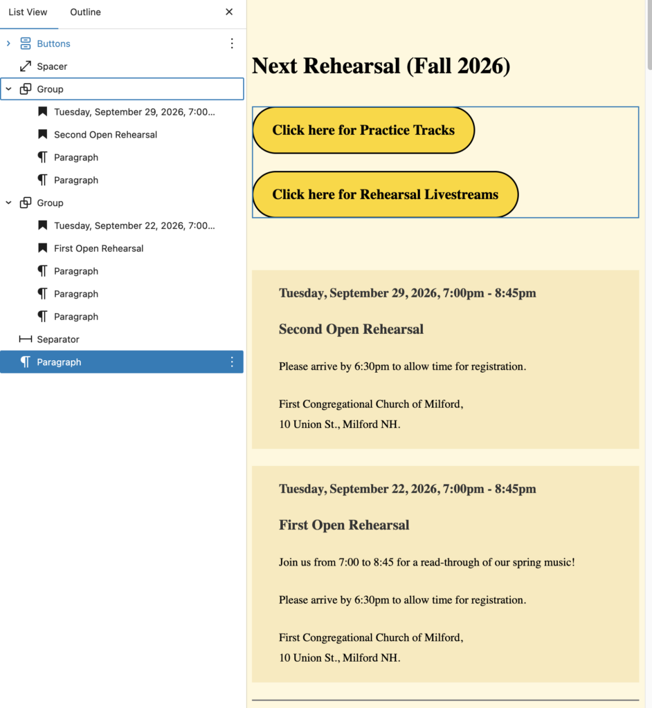 3) Finally, change the contents of the two remaining Group blocks to represent the actual Open Rehearsal information.